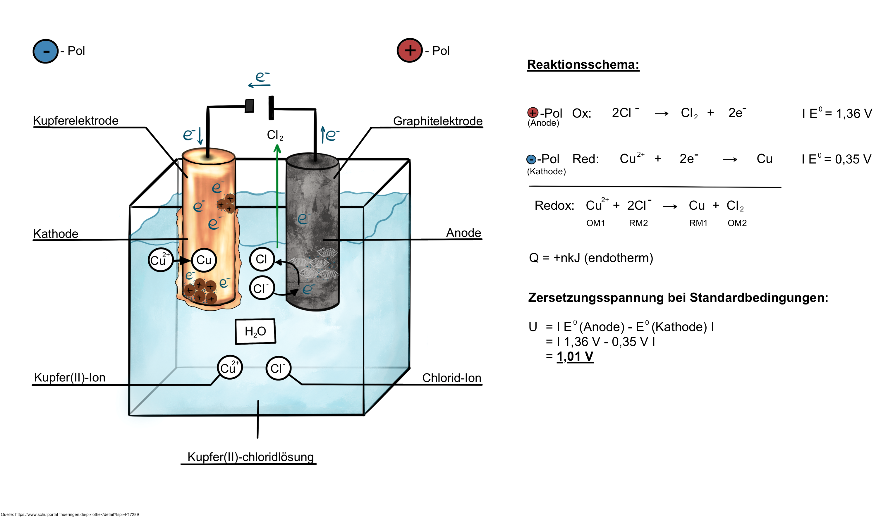 Das Bild gehört zur Serie "Elektrochemie". Es verdeutlicht den Aufbau einer Elektrolyse am Beispiel einer Kupfer(II)-chlorid-Lösung. Bild-Variante: farbig, beschriftet, mit Erläuterung. Es gelten die Nutzungsbedingungen der Mediothek und Pixiothek.