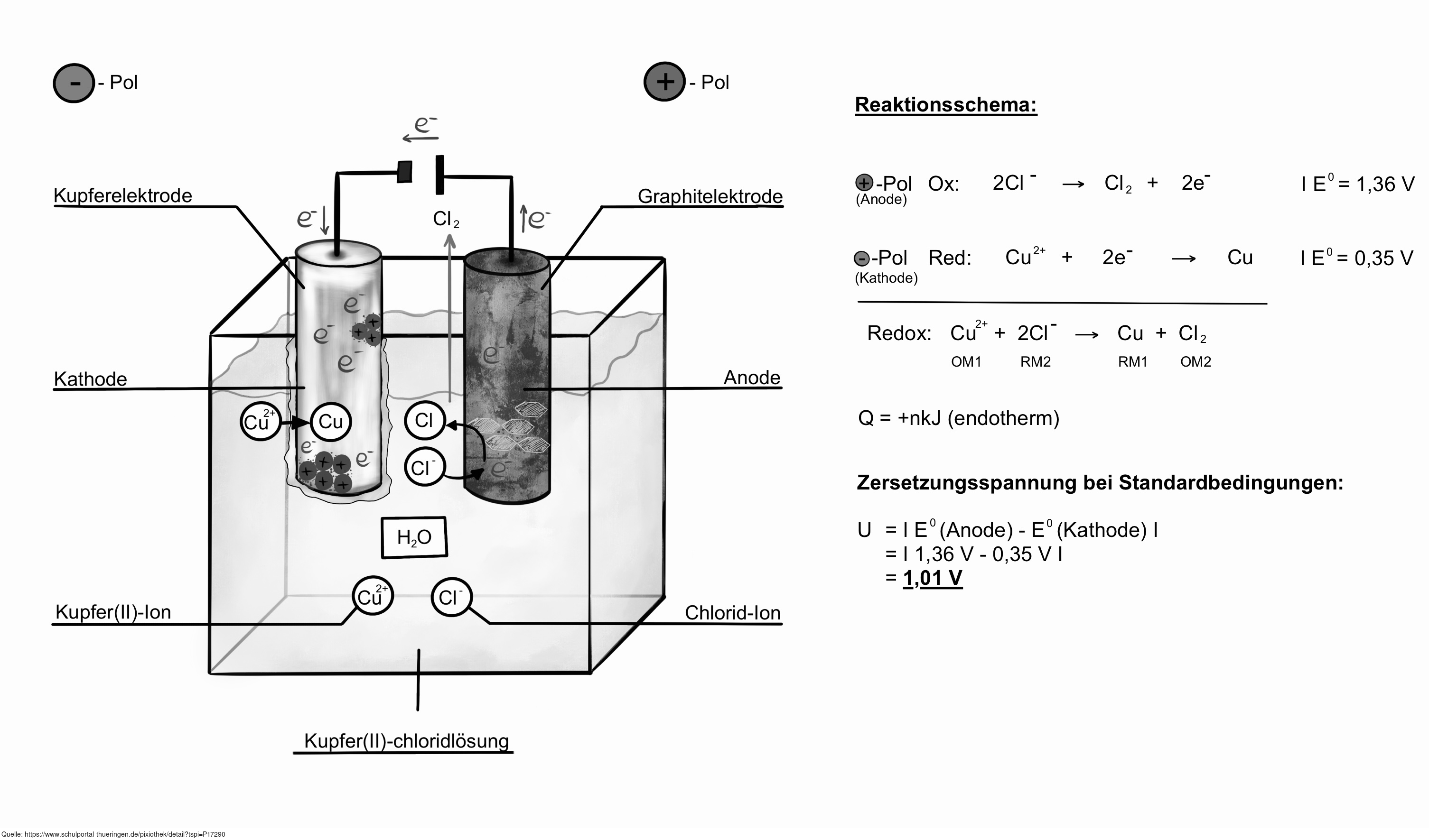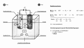 Das Bild gehört zur Serie "Elektrochemie". Es verdeutlicht den Aufbau einer Elektrolyse am Beispiel einer Kupfer(II)-chlorid-Lösung. Bild-Variante: s/w, beschriftet, mit Erläuterung. Es gelten die Nutzungsbedingungen der Mediothek und Pixiothek.