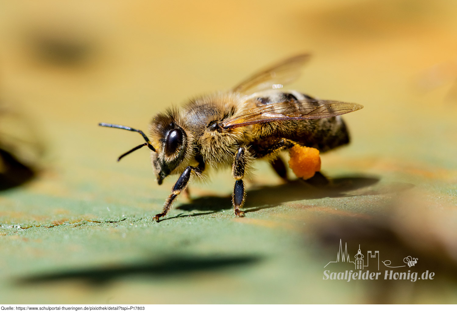 Das Bild gehört zur Serie "Saalfelder Honig", aufgenommen vom Imker Bernd Rümpler, Inhaber von saalfelder-honig.de. Zu sehen ist eine weibliche Honigbiene (Arbeiterin) mit Pollenhöschen.