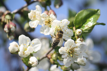 Das Bild gehört zur Serie "Saalfelder Honig", aufgenommen vom Imker Bernd Rümpler, Inhaber von saalfelder-honig.de. Zu sehen ist eine Honigbiene (Flugbiene) auf Kirschblüten. Es gelten die Nutzungsbedingungen der Mediothek und Pixiothek.