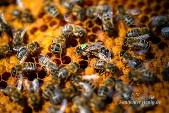 Das Bild gehört zur Serie "Saalfelder Honig", aufgenommen vom Imker Bernd Rümpler, Inhaber von saalfelder-honig.de. Zu sehen ist eine Bienenkönigin (gezeichnet) umringt von Arbeiterinnen (Stockbienen) bei der Eiablage. Es gelten die Nutzungsbedingungen der Mediothek und Pixiothek.