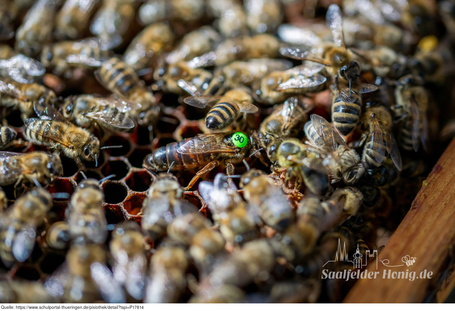 Das Bild gehört zur Serie "Saalfelder Honig", aufgenommen vom Imker Bernd Rümpler, Inhaber von saalfelder-honig.de. Zu sehen ist ein Imker am geöffneten Bienenvolk mit gezogener Wabe. Es gelten die Nutzungsbedingungen der Mediothek und Pixiothek.