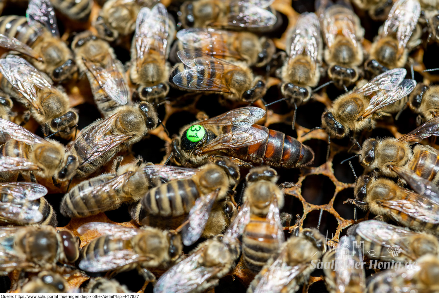 Das Bild gehört zur Serie "Saalfelder Honig", aufgenommen vom Imker Bernd Rümpler, Inhaber von saalfelder-honig.de. Zu sehen ist eine Bienenkönigin (gezeichnet) umringt von Arbeiterinnen (Stockbienen) auf der Suche nach geputzten Zelle, in welche sie jeweils ein Ei ablegen kann. Es gelten die Nutzungsbedingungen der Mediothek und Pixiothek.