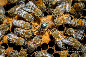Das Bild gehört zur Serie "Saalfelder Honig", aufgenommen vom Imker Bernd Rümpler, Inhaber von saalfelder-honig.de. Zu sehen ist eine Bienenkönigin (gezeichnet) umringt von Arbeiterinnen (Stockbienen) bei der Eiablage. Dazu schiebt sie ihrem Hinterlieb in die Zelle.