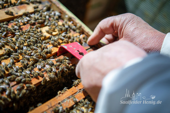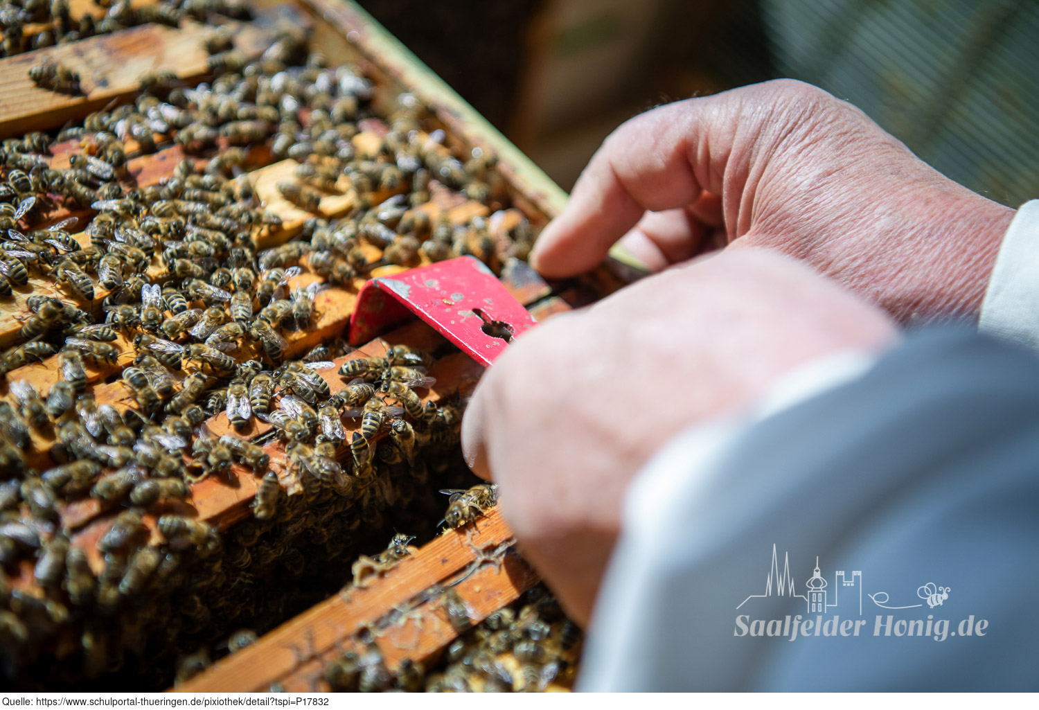 Das Bild gehört zur Serie "Saalfelder Honig", aufgenommen vom Imker Bernd Rümpler, Inhaber von saalfelder-honig.de. Zu sehen ist ein Imker mit Stockmeisel am geöffnetem Bienenvolk beim Ziehen einer Wabe. Es gelten die Nutzungsbedingungen der Mediothek und Pixiothek.