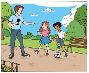 Das Bild zeigt einen Vater, der in der Hand ein Handy hält und mit seinen beiden Kindern spricht, weil er ein Foto von ihnen anfertigen möchte. Das Bild kann als Teil einer Bildergeschichte verwendet werden - siehe Funktionslink "Weitere Bilder der Serie". Es gelten die Nutzungsbedingungen der Mediothek und Pixiothek.
