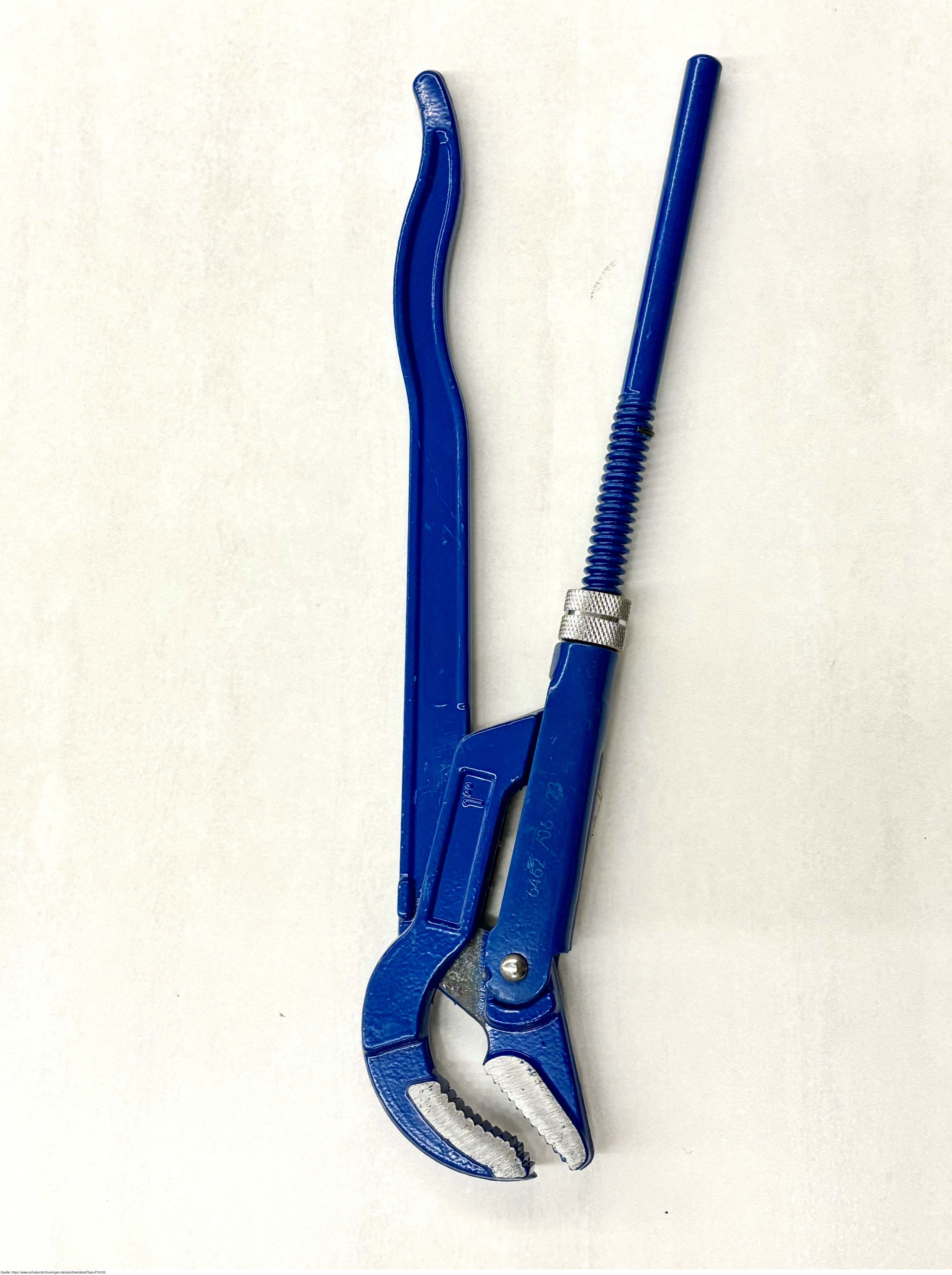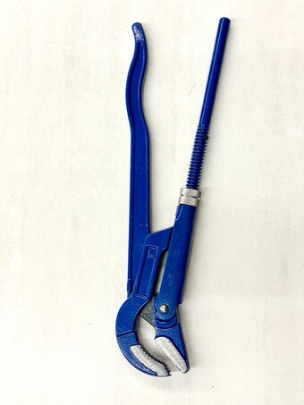 Das Bild zeigt eine Rohrzange, die speziell für Arbeiten an Rohren konzipiert ist, deren Größe 1 Zoll (ca. 2,54 cm) beträgt. Der Begriff „Eck-“ deutet darauf hin, dass der Kopf der Zange um 45° abgewinkelt ist, um schwer zugängliche Stellen besser zu erreichen. CV steht für Chrom-Vanadium-Stahl, ein hochwertiger und widerstandsfähiger Stahl für Werkzeuge.