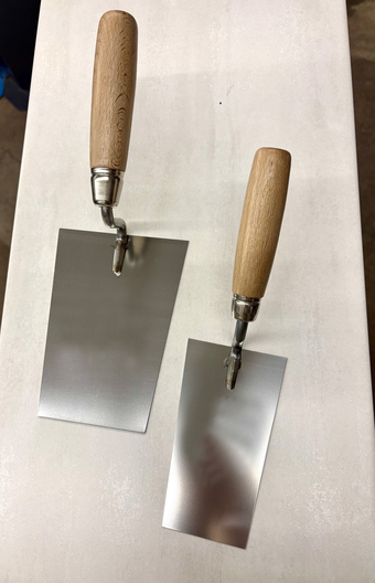 Das Bild zeigt zwei eckige Kellen in den Größen 140 und 160mm mit geradem Hals. Diese Maurer- oder auch Putzkelle genannt ist ein Werkzeug zur Verarbeitung des Mörtels beim Mauern oder Putzen. Es gelten die Nutzungsbedingungen der Mediothek und Pixiothek.