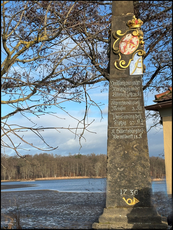 Das Bild zeigt eine originale Postmeilensäule von 1730, am Originalstandort, der Auffahrt zum Schloss Moritzburg, die im oberen Bereich restauriert wurde.