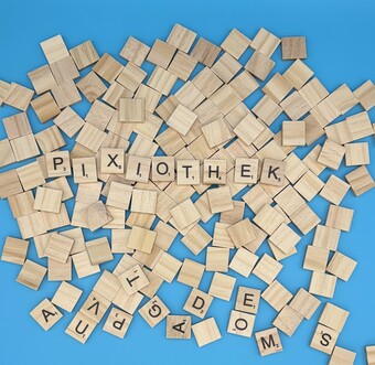 Aus Buchstaben wurde das Wort "Pixiothek" gelegt. Es gelten die Nutzungsbedingungen der Mediothek und Pixiothek.