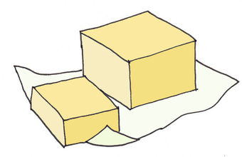 Das Bild zeigt ein gezeichnetes Stück Butter (farbig). Es gehört zur Serie "Ernährungspyramide zum Basteln und Gestalten" und findet u.a. im gleichnamigen Lernobjekt unter https://www.schulportal-thueringen.de/web/guest/media/detail?tspi=18517 Verwendung. Es gelten die Nutzungsbedingungen der Mediothek und Pixiothek.