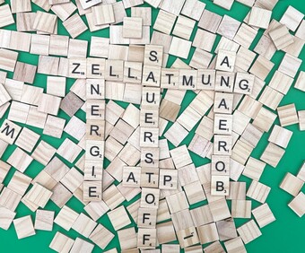 Aus Buchstaben wurden die Begriffe "Zellatmung", "Energie", "Sauerstoff", "ATP" und "anaerob" gelegt. Es gelten die Nutzungsbedingungen der Mediothek und Pixiothek.