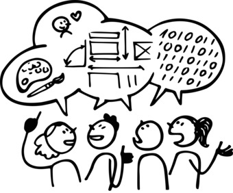 Die Zeichnung zeigt eine symbolhafte Szene zur Darstellung von Kollaboration bzw. Zusammenarbeit. Das Bild ist unter CC0 lizenziert und kann somit frei verwendet werden. Es ist neben weiteren Bildern auch hier zu finden: https://cocomaterial.com