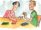 Die Zeichnung zeigt eine symbolhafte Szene zur Darstellung von Partnerarbeit. Das Bild ist unter CC0 lizenziert und kann somit frei verwendet werden. Es ist neben weiteren Bildern auch hier zu finden: https://cocomaterial.com