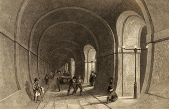 Die Abbildung zeigt den Thames Tunnel, dt. Themse-Tunnel. Er unterquert die Themse in London und verbindet die Stadtteile Rotherhithe und Wapping miteinander. Der Tunnel ist etwa 10 Meter breit und 366 Meter lang. Er wurde 1843 fertiggestellt und war der weltweit erste Tunnel unter einem Fließgewässer.