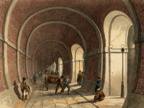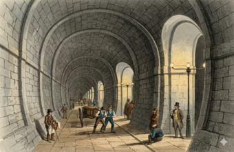 Die Abbildung zeigt den Thames Tunnel, dt. Themse-Tunnel. Er unterquert die Themse in London und verbindet die Stadtteile Rotherhithe und Wapping miteinander. Der Tunnel ist etwa 10 Meter breit und 366 Meter lang. Er wurde 1843 fertiggestellt und war der weltweit erste Tunnel unter einem Fließgewässer.