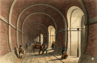 Die Abbildung zeigt den Thames Tunnel, dt. Themse-Tunnel. Er unterquert die Themse in London und verbindet die Stadtteile Rotherhithe und Wapping miteinander. Der Tunnel ist etwa 10 Meter breit und 366 Meter lang. Er wurde 1843 fertiggestellt und war der weltweit erste Tunnel unter einem Fließgewässer.