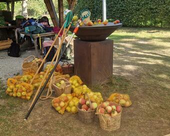 Das Bild zeigt eine Ansicht auf dem ApfelGut Erfurt. Zu sehen sind im Hintergrund die Jacken und Taschen einer Schulklasse, welche am außerschulischen Lernort zu Besuch ist. Im Vordergrund befinden sich Apfelpflücker bzw. Obstpflücker und bereits geerntete Äpfel in Netzen. Es gelten die Nutzungsbedingungen der Mediothek und Pixiothek.