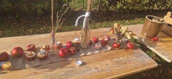 Das Bild zeigt einen mit Äpfeln dekorierten Tisch auf dem ApfelGut Erfurt. Es gelten die Nutzungsbedingungen der Mediothek und Pixiothek.