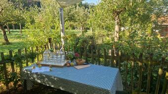 Das Bild zeigt eine Ansicht auf dem ApfelGut Erfurt. Auf einem Tisch mit einer blau-weiß karierten Tischdecke stehen Gläser, Karaffen und Äpfel bereit. Im Hintergrund befindet sich ein Holzzaun, der das Areal begrenzt. Es gelten die Nutzungsbedingungen der Mediothek und Pixiothek.