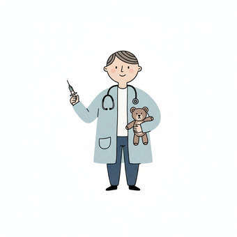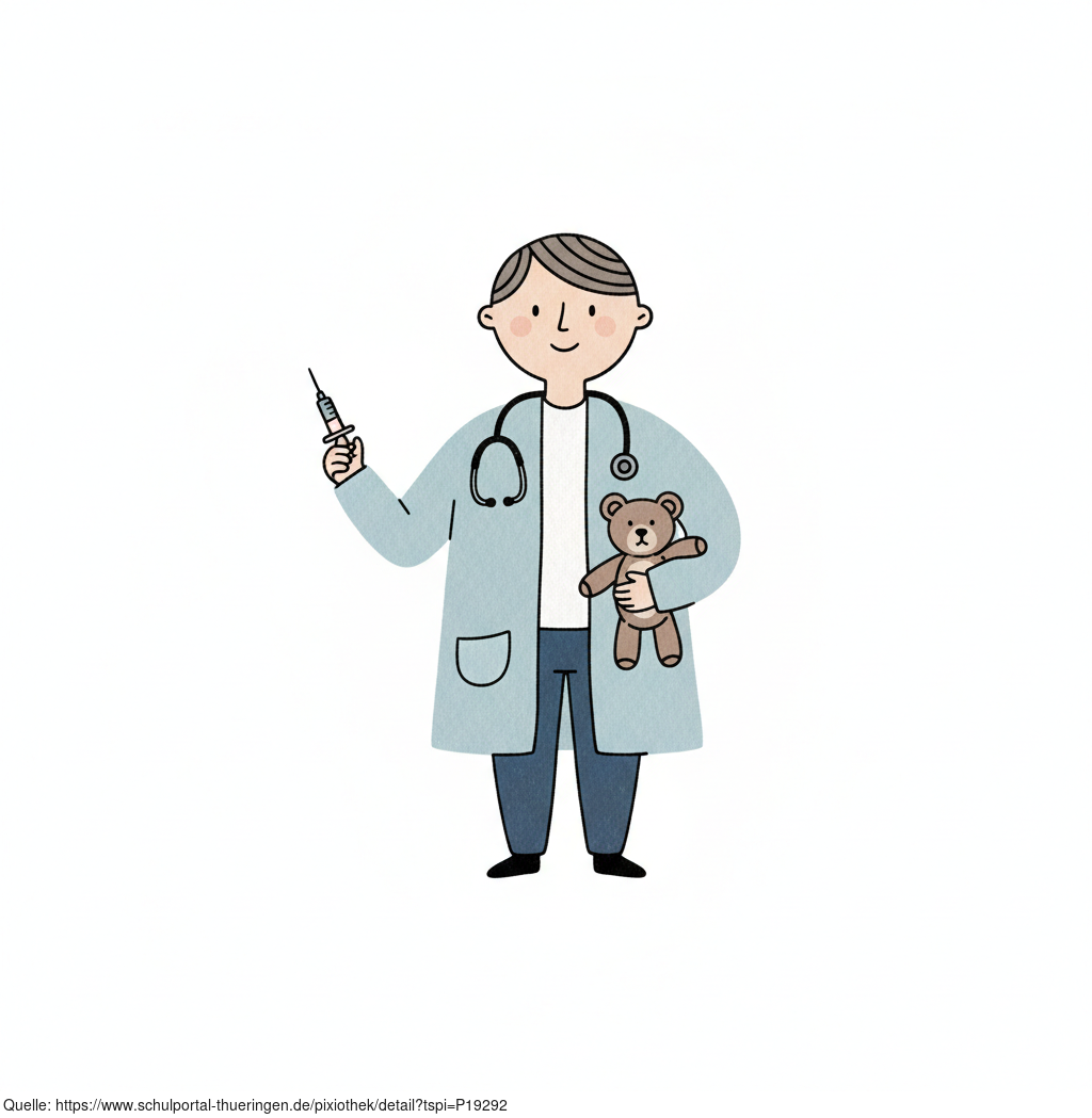 Das Bild zeigt einen gezeichneten Arzt mit Stethoskop, Spritze und Teddy. Das Bild wurde mittels einer KI (Gemini) erstellt und ist unter CC0 lizenziert. Weitere Bilder aus Herrn Emrich-Försters Bild-Archiv findet man hier: https://pix.foerster.rocks/
