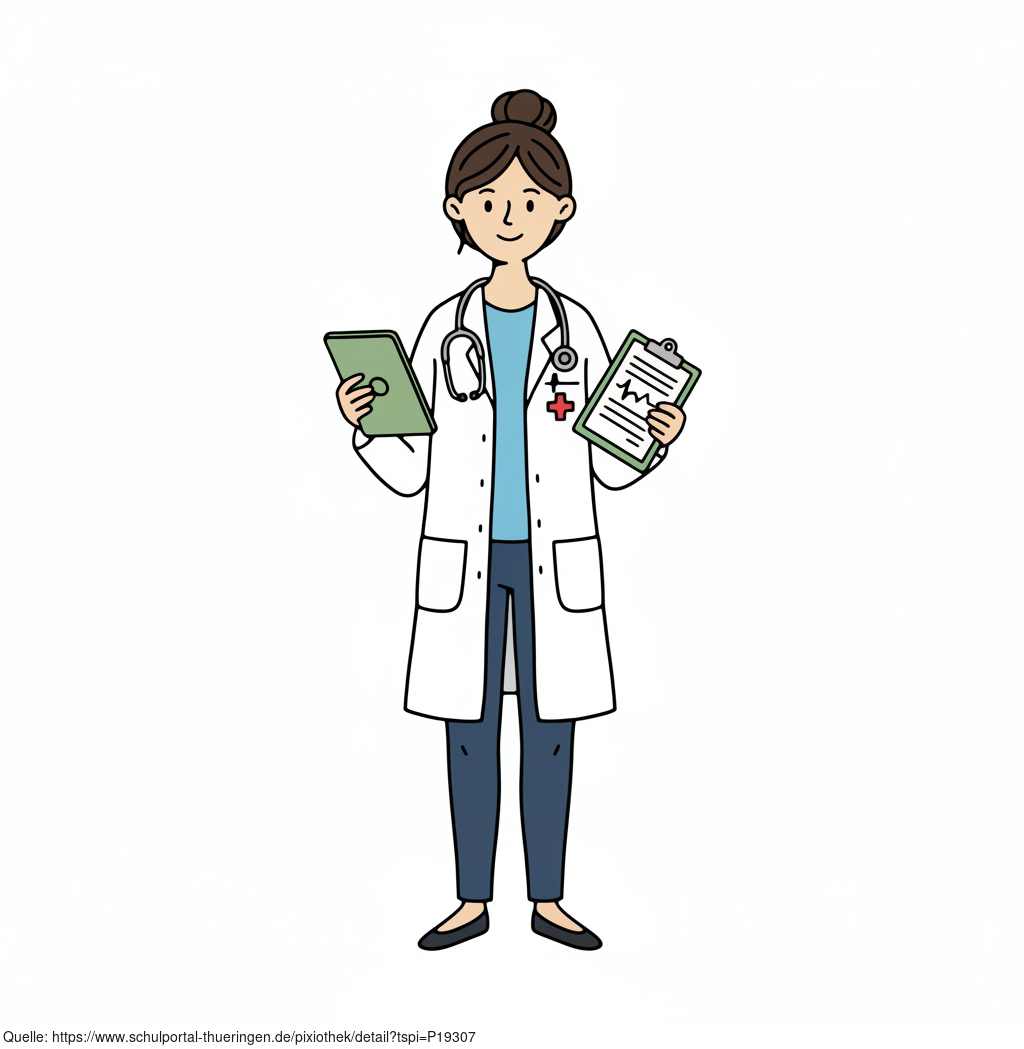 Das Bild zeigt eine gezeichnete Ärztin mit Stethoskop. Das Bild wurde mittels einer KI (Gemini) erstellt und ist unter CC0 lizenziert. Weitere Bilder aus Herrn Emrich-Försters Bild-Archiv findet man hier: https://pix.foerster.rocks/