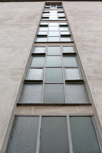 Abgebildet ist das Lichtband des Treppenhauses vom Konsumgebäude, dem Gebäude für den Konsumverein für Dessau und Umgegend (1928, Architekt Walter Gropius).