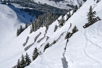 Das Foto gehört zur Serie "Lawinenschutz" mit Fotos aus den Gegenden Walmendinger Horn (Österreich, Kleinwalsertal) und Fellhorn (Deutschland). Es zeigt Stahlschneebrücken am Berghang. Solche Lawinenverbauungen schützen Siedlungen, Verkehrswege und Sportgebiete vor Lawinen. Es gelten die Nutzungsbedingungen der Mediothek und Pixiothek.