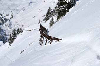 Das Foto gehört zur Serie "Lawinenschutz" mit Fotos aus den Gegenden Walmendinger Horn (Österreich, Kleinwalsertal) und Fellhorn (Deutschland). Es zeigt Stahlschneebrücken am Berghang. Solche Lawinenverbauungen schützen Siedlungen, Verkehrswege und Sportgebiete vor Lawinen. Es gelten die Nutzungsbedingungen der Mediothek und Pixiothek.