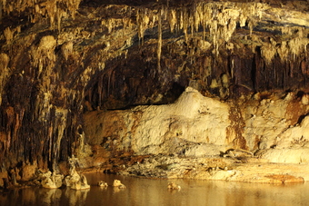 Abgebildet ist eine Grotte mit Tropfsteinen.