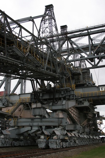 Dieses Bild zeigt das baggerseitige Fahrwerk mit Antriebsmotoren. Es gelten die Nutzungsbedingungen der Mediothek und Pixiothek.