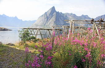Das Foto gehört zur Serie "Lofoten". Es zeigt Weidenröschen und Trockengestelle für Stockfisch. Es gelten die Nutzungsbedingungen der Mediothek und Pixiothek.