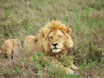 Ein männlicher Löwe in Tansania. Löwen gehören zur Ordnung Raubtiere (Carnivora), zur Überfamilie Katzenartige (Feloidea) und zur Familie Katzen (Felidae).