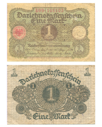 Das Foto gehört zur Serie "Zahlungsmittel in der Weimarer Republik (1918-1933)". Es zeigt einen Darlehenskassenschein über "Eine Mark" der Reichsschuldenverwaltung Berlin vom 01. März 1920 . Es gelten die Nutzungsbedingungen der Mediothek und Pixiothek.