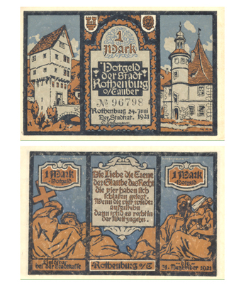 Das Foto gehört zur Serie "Zahlungsmittel in der Weimarer Republik (1918-1933)". Es zeigt Notgeld über "Eine Mark" aus Rothenburg ob der Tauber vom 24. Juni 1921. Es gelten die Nutzungsbedingungen der Mediothek und Pixiothek.