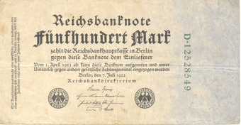 Das Foto gehört zur Serie "Zahlungsmittel in der Weimarer Republik (1918-1933)". Es zeigt eine Reichsbanknote über "Fünfhundert Mark" vom 07. Juli 1922. Es gelten die Nutzungsbedingungen der Mediothek und Pixiothek.