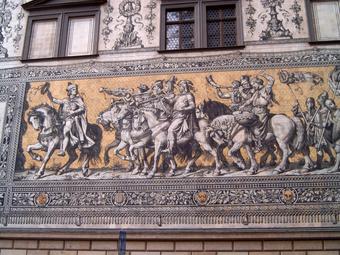 Der Fürstenzug in Dresden ist das Bild eines Reiterzuges, aufgetragen auf rund 23.000 Fliesen aus Meißner Porzellan auf der Außenwand des Stallhofs in der Augustusstraße. Das 102 Meter lange Kunstwerk stellt die Ahnengalerie der zwischen 1127 und 1873 in Sachsen herrschenden Markgrafen, Herzöge, Kurfürsten und Könige aus dem Geschlecht des Fürstenhauses Wettin dar. Es gelten die Nutzungsbedingungen der Mediothek und Pixiothek.