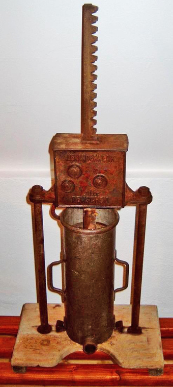 Das Foto gehört zur Serie "Historische Getriebe". Es zeigt das Zahnstangengetriebe an einer Wurststopfvorrichtung. Es gelten die Nutzungsbedingungen der Mediothek und Pixiothek.