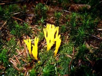 Das Foto gehört zur Serie "Waldpilze". Es zeigt einen Klebrigen Hörnling (Calocera viscosa). Es gelten die Nutzungsbedingungen der Mediothek und Pixiothek.