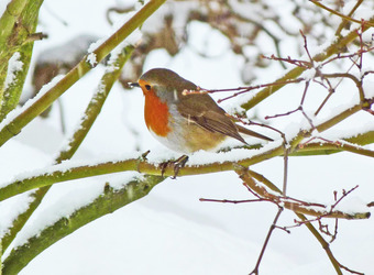 Das Foto gehört zur Serie "Vögel im Winter". Es zeigt ein Rotkehlchen. Es gelten die Nutzungsbedingungen der Mediothek und Pixiothek.