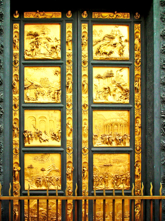 Das Foto gehört zur Serie "Paradiestür am Baptisterium von Florenz". Es zeigt die Gesamtansicht der Paradiestür (auch Paradiespforte genannt) mit den zehn Bronzereliefs von Lorenzo Ghiberti. Es gelten die Nutzungsbedingungen der Mediothek und Pixiothek.