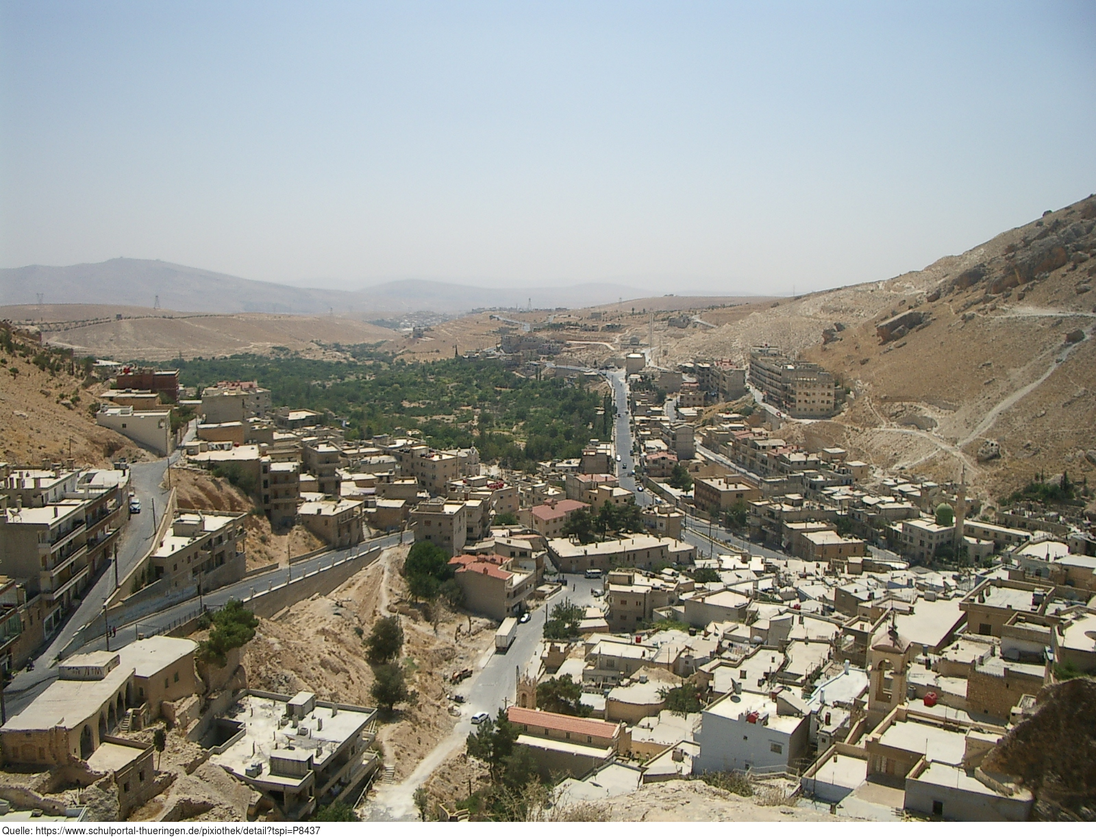 Das Foto gehört zur Serie "Syrien 2004". Es zeigt Maalula, eine Stadt nordöstlich von Damaskus, die insbesondere von melkitischen Christen bewohnt wird. Hier und in einem Nachbarort wird (und sonst nirgends mehr auf der Welt) Aramäisch gesprochen – ein westaramäischer Dialekt – die Sprache, in der einst auch Jesus Christus gesprochen hat. In dem Ort befindet sich in Fels gehauen die der Überlieferung nach älteste Kirche der Christenheit aus dem 1. Jahrhundert. Darüber hinaus befindet sich dort auch eines der ältesten christlichen Klöster, das Kloster der Heiligen Thekla. Maalula ist einer der Schauplätze des herausragenden Romanes von Rafik Shami „Die dunkle Seite der Liebe“. Es gelten die Nutzungsbedingungen der Mediothek und Pixiothek.