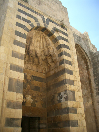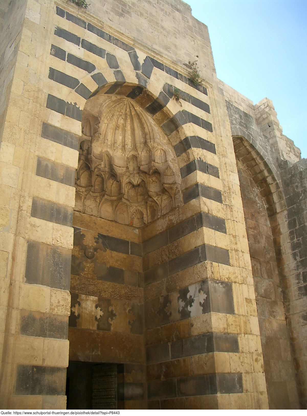 Das Foto gehört zur Serie "Syrien 2004". Es zeigt ein Portal, das zur Residenz des Mamluken-Gouverneurs in der Zitatelle von Aleppo führt. Aleppo ist eine Stadt im Norden Syriens. 1986 erklärte die UNESCO die Altstadt Aleppos zum Weltkulturerbe. Im Bürgerkrieg war die Stadt zwischen Sommer 2012 bis Dezember 2016 umkämpft und stark zerstört worden. Es gelten die Nutzungsbedingungen der Mediothek und Pixiothek.