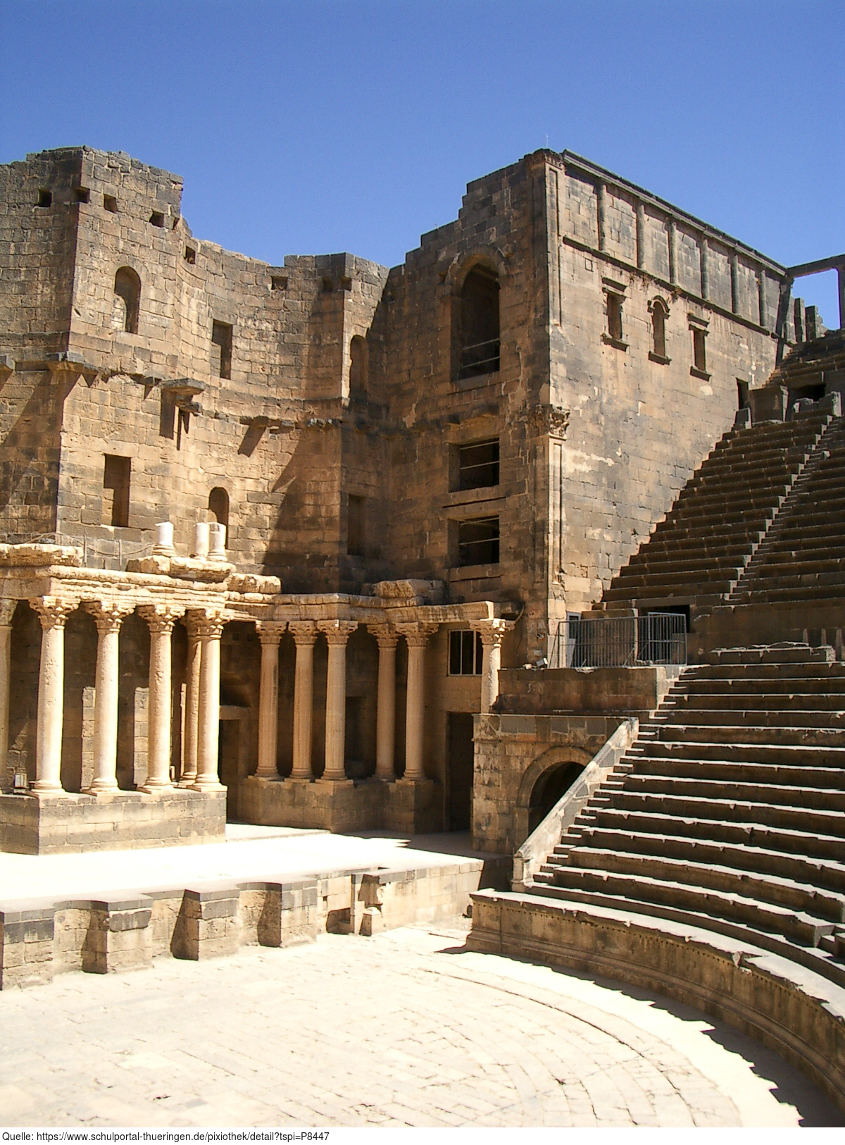 Das Foto gehört zur Serie "Syrien 2004". Es zeigt das bekannteste Zeugnis der Vergangenheit in Bosra, das gut erhaltene römische Theater. Es wurde im 3. Jahrhundert n. Chr. errichtet. 15000 Zuschauer fanden hier Platz. Es gelten die Nutzungsbedingungen der Mediothek und Pixiothek.