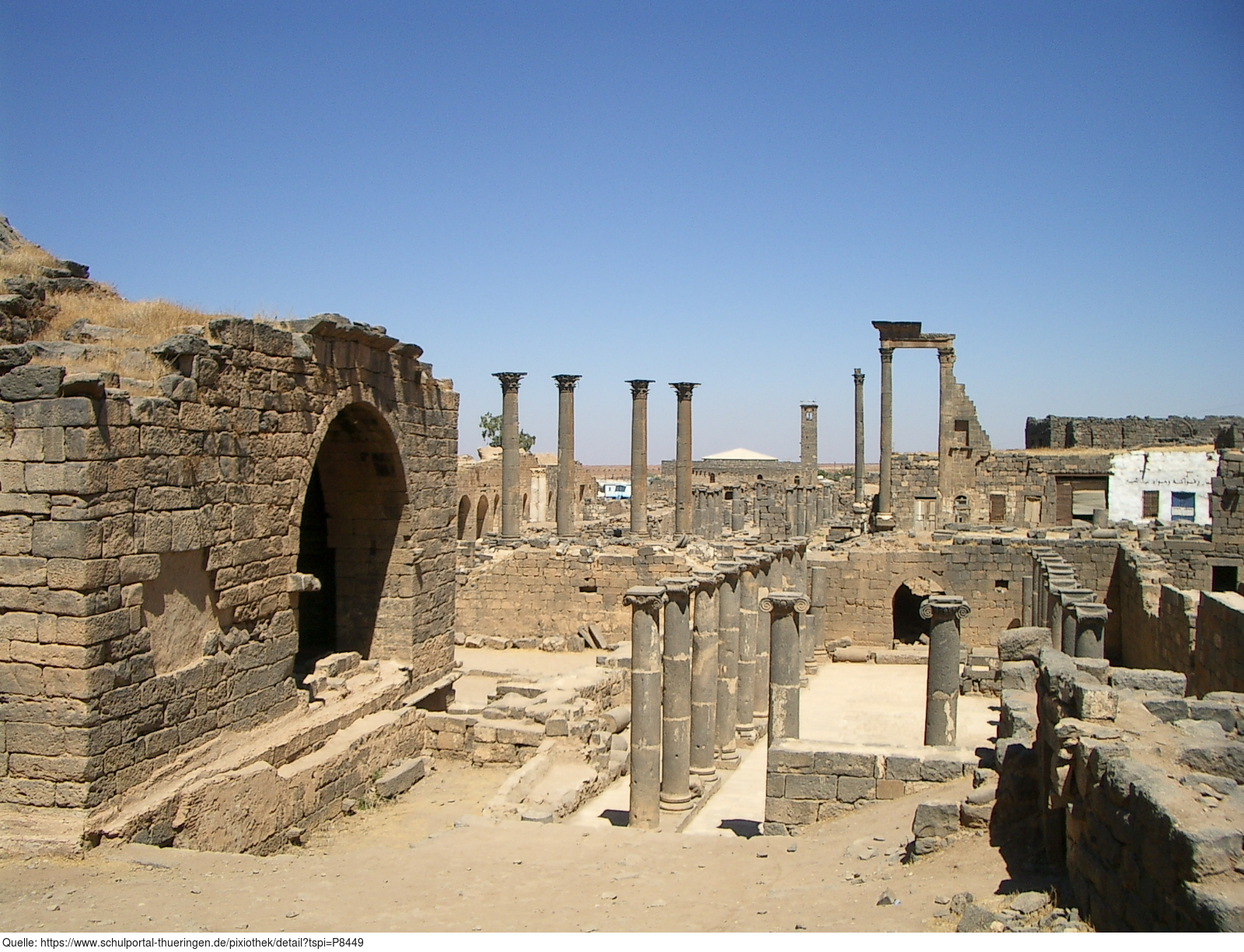 Das Foto gehört zur Serie "Syrien 2004". Es zeigt historische Ruinen in Bosra. Das bekannteste Zeugnis der Vergangenheit in Bosra, das gut erhaltene römische Theater, wurde im 3. Jahrhundert n. Chr. errichtet. 15000 Zuschauer fanden hier Platz. Es gelten die Nutzungsbedingungen der Mediothek und Pixiothek.