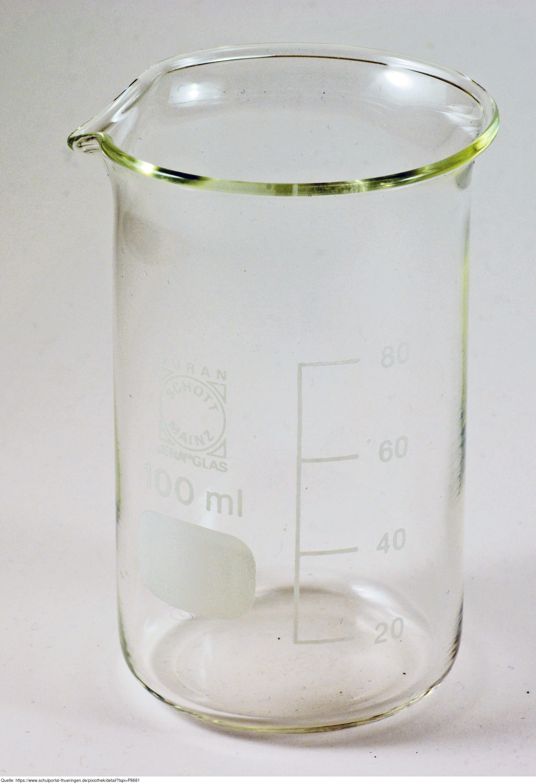 Das Bild gehört zur Serie "Laborgeräte". Es zeigt ein Becherglas mit 100 Milliliter Fassungsvermögen und einer Einteilung der Skala in 20 ml-Schritten. Das Bild ist unter CC0 lizenziert und kann somit frei verwendet werden.