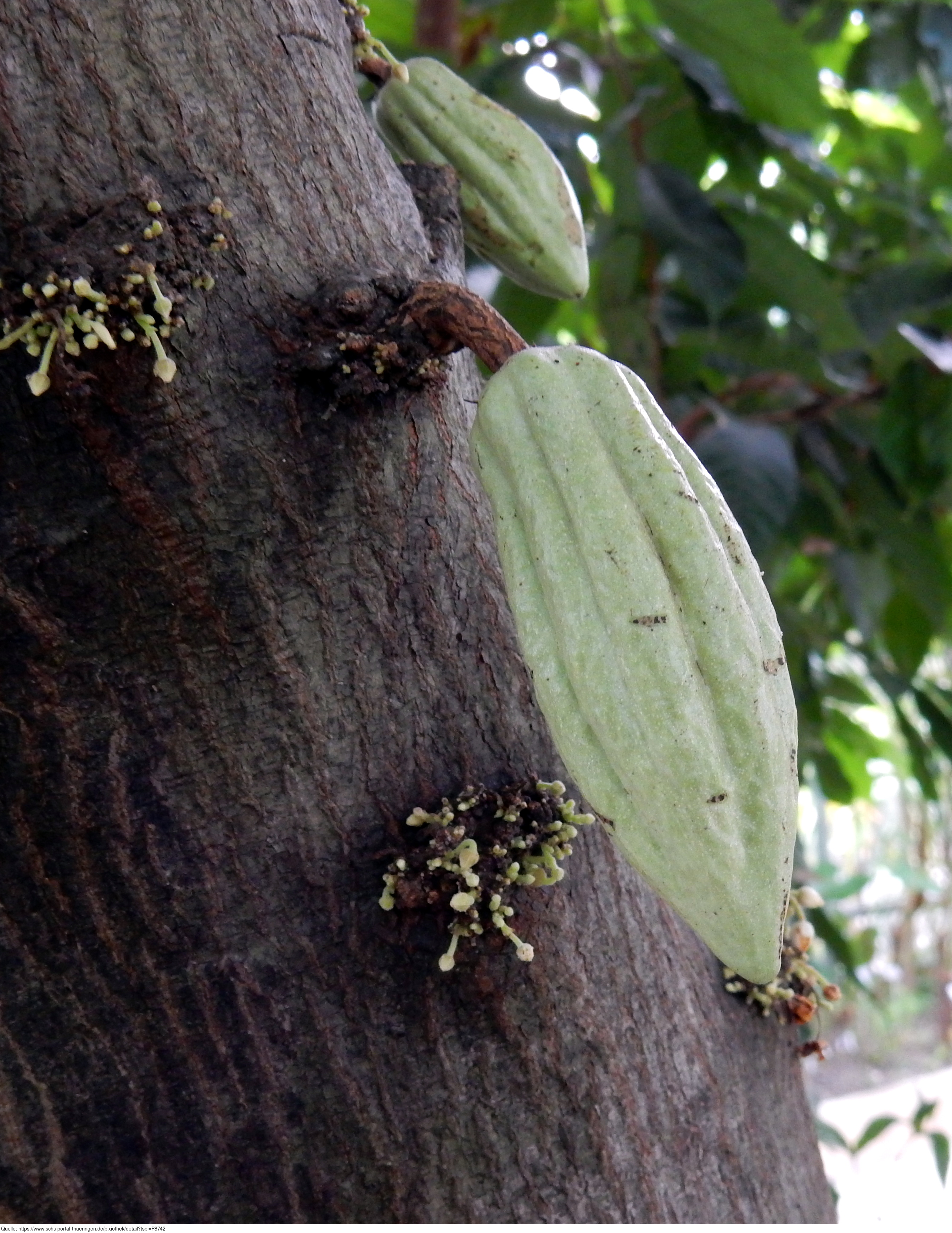 Das Foto gehört zur Serie "Kakao". Es zeigt geschlossene, geöffnete und verwelkte Blüten sowie sich entwickelnde Früchte am Stamm eines Kakaobaums. Das Bild ist unter CC0 lizenziert und kann somit frei verwendet werden.
