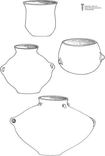 Das Bild gehört zur Serie "Zeichnungen Steinzeit - Museum für Ur- und Frühgeschichte Thüringens". Abgebildet sind Tongefäße. Es gelten die Nutzungsbedingungen der Mediothek und Pixiothek.