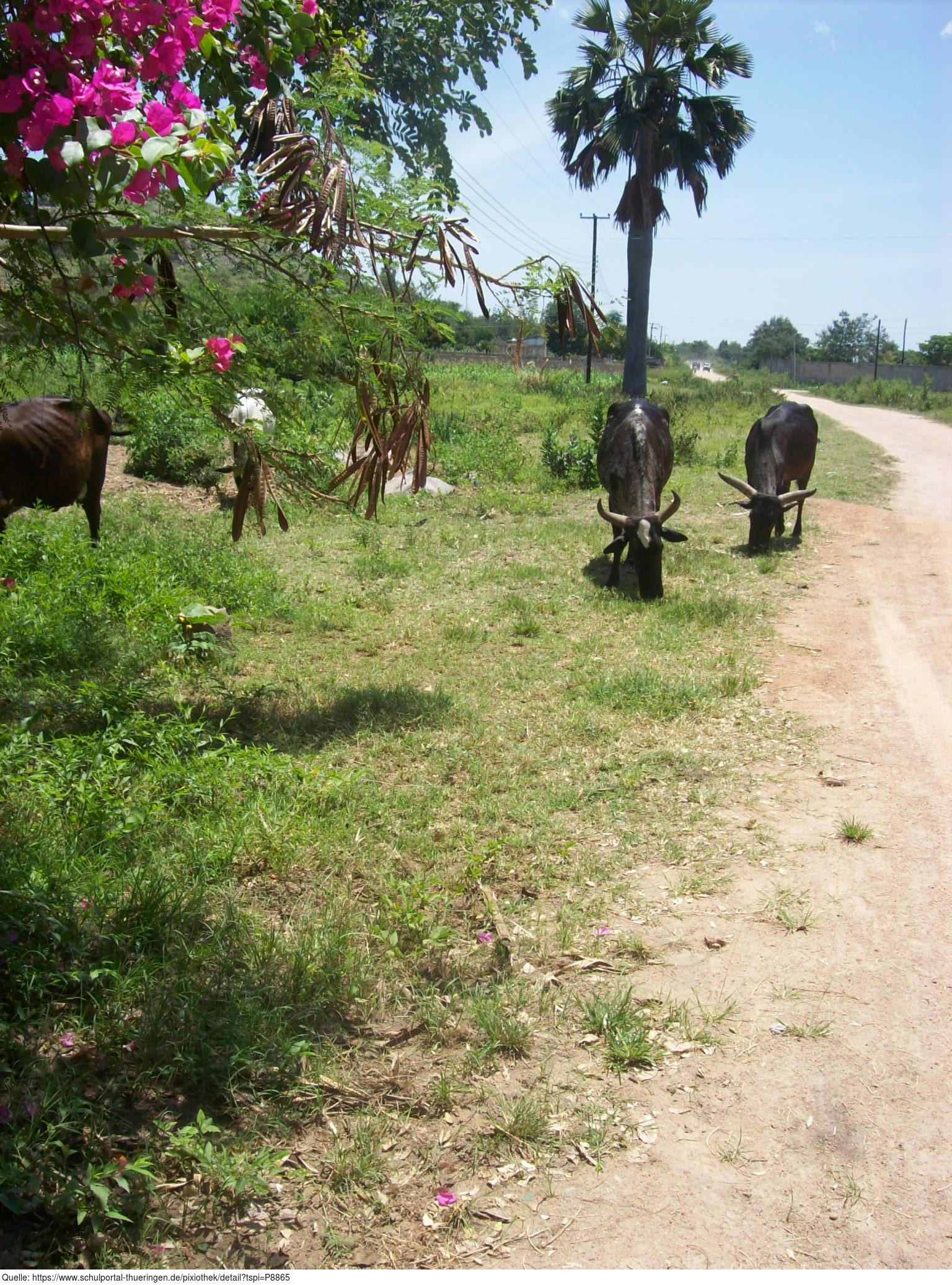 Das Bild wurde in Tansania aufgenommen. Es zeigt Rinder auf einem Wiesenstück am Straßenrand. Es gelten die Nutzungsbedingungen der Mediothek und Pixiothek.