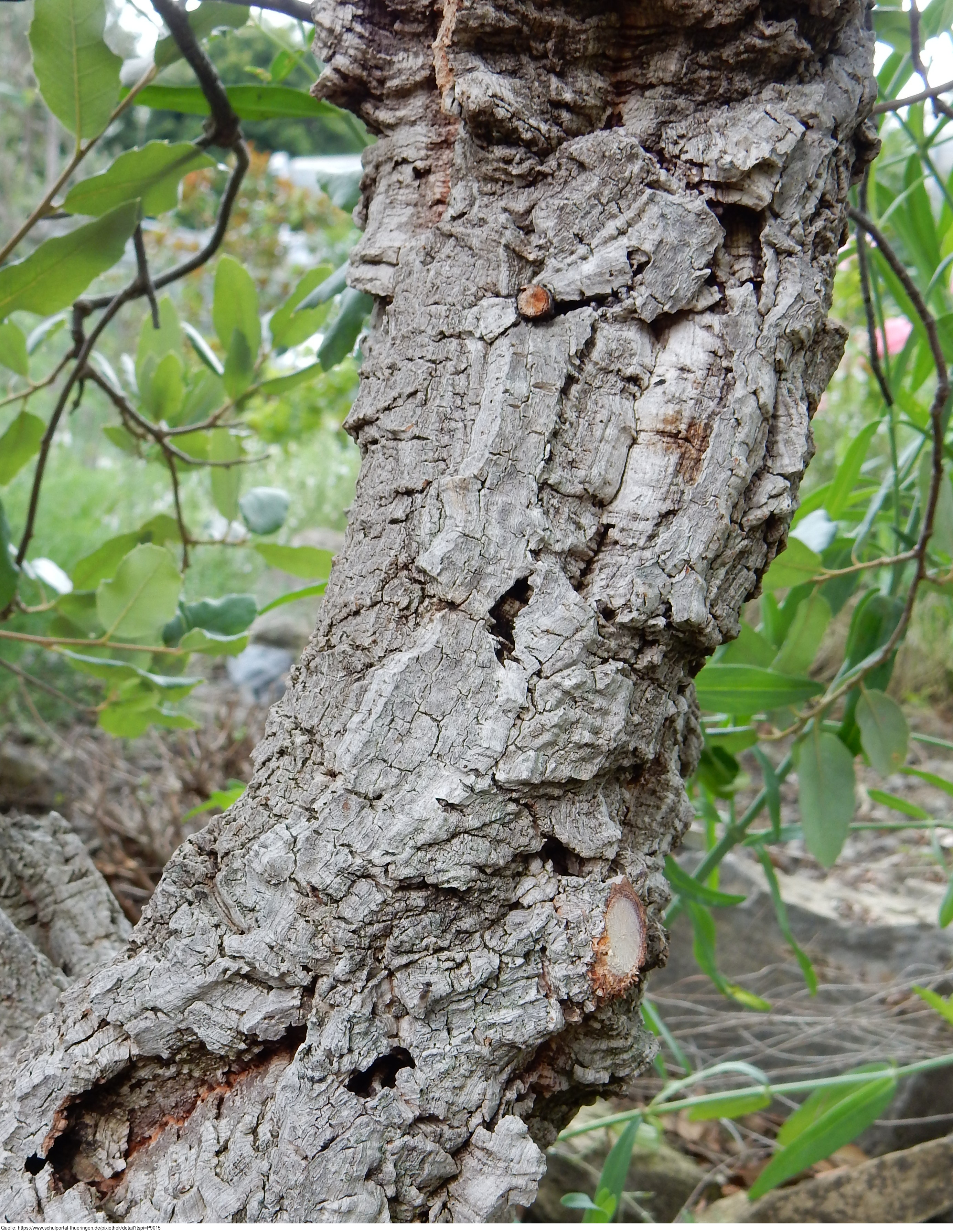 Das Foto gehört zur Serie "Laubbäume". Es zeigt den Stamm einer Korkeiche (Quercus suber L.). Die Korkeiche ist ein immergrüner Laubbaum des westlichen Mittelmeerraums. Das Bild ist unter CC0 lizenziert und kann somit frei verwendet werden.